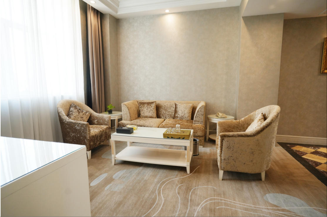 房间设施: 茶几、沙发、座椅、衣柜、双人床、电视、免费上网、梳妆台、写字台、保险箱、淋浴、浴缸、座便器、台灯、电话、电水壶、冰箱、茶杯、挂机空调、吹风机、拖鞋等。